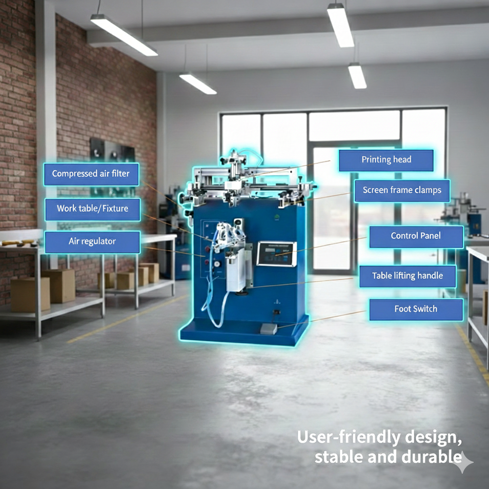 This Cylinder Screen Printing Machine is widely used in plastic drink bottle, drum, cosmetic bottle, plastic/paper/foam cup, glass bottle, stainless mug, piston, paint barrel, etc..